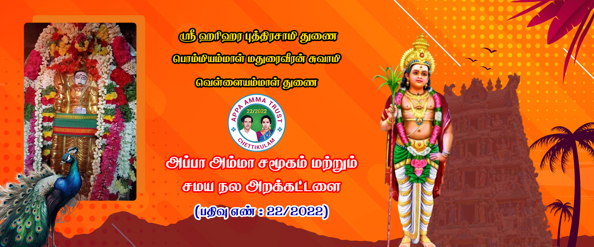 அப்பா அம்மா சமூகம் மற்றும் சமய நல அறக்கட்டளையின் அன்னதானம், பொதுப்பணி முகாம், தீபங்கள் ஏற்றப்படாத கோவில்களுக்கு தீபம் ஏற்றுதல் மற்றும் திருக்கோவிலின் திருவீதி உலாவிற்கு வரும் வாகனங்களை பழுது பார்த்தல் என நற்செயல்களுக்காக தாங்கள் தங்களால் முடிந்த நன்கொடையினை அளித்து நமது அறக்கட்டளைக்கு உதவுமாறு கேட்டுக்கொள்கிறோம்.
