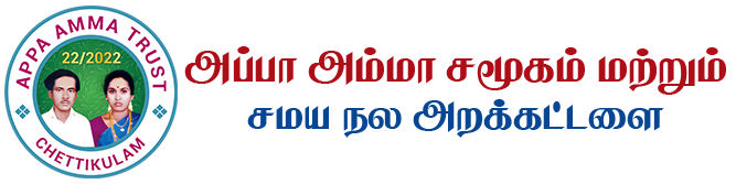 அப்பா அம்மா சமூகம் மற்றும் சமய நல அறக்கட்டளையின் அன்னதானம், பொதுப்பணி முகாம், தீபங்கள் ஏற்றப்படாத கோவில்களுக்கு தீபம் ஏற்றுதல் மற்றும் திருக்கோவிலின் திருவீதி உலாவிற்கு வரும் வாகனங்களை பழுது பார்த்தல் என நற்செயல்களுக்காக தாங்கள் தங்களால் முடிந்த நன்கொடையினை அளித்து நமது அறக்கட்டளைக்கு உதவுமாறு கேட்டுக்கொள்கிறோம்.